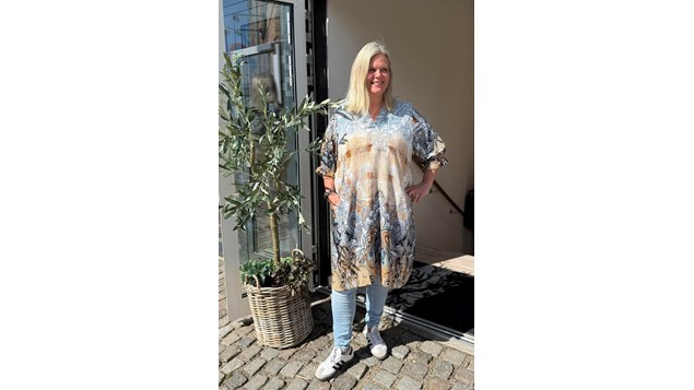 Kjolen er i det flotteste print, smock i ærmet, V-hals og bedst af alt, så er der lommer i