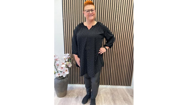 Tunika fra No.1 by Ox, med små klare sten, trekvart ærme, og lille V i halsen.